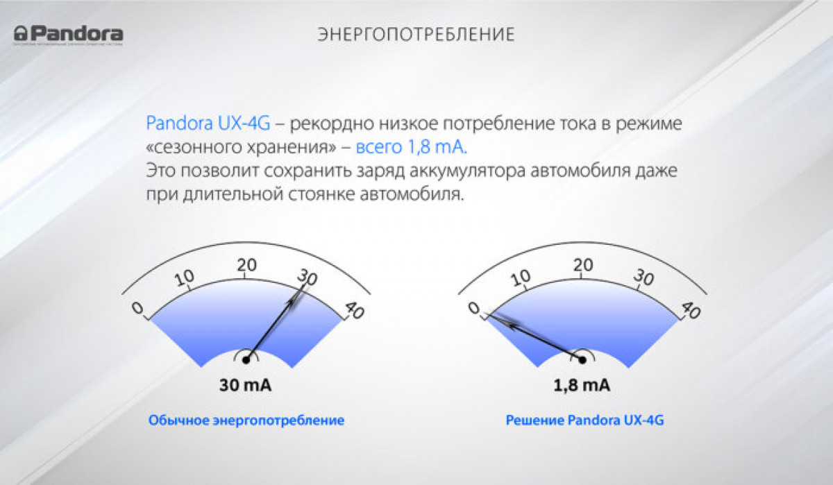 Для сезонного хранения автомобилей очень важным является поддержание АКБ в рабочем состоянии и недопущение глубокого разряда в период простоя. Pandora UX-4G имеет рекордно низкое потребление тока в режиме сезонного хранения: всего 1,8 мА, то есть 1,2 А/ч в месяц. Учитывая, что в современных автомобилях применяются аккумуляторные батареи емкостью в 50 А/ч, вы можете не беспокоиться, даже если машина месяцами стоит без движения.