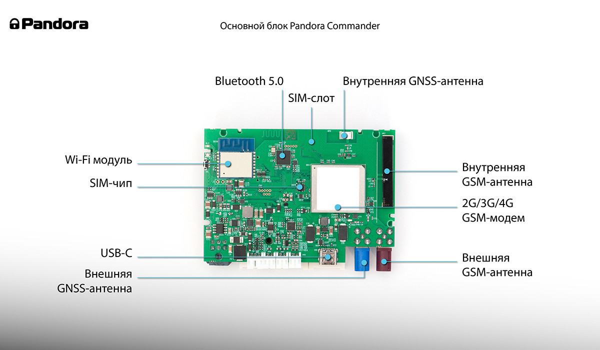 Pandora Commander Фирменный представляет собой охранно-телематический комплекс нового поколения, созданный на современной платформе FX. Система оснащена универсальным GSM-модемом с поддержкой сетей 4G, 3G и 2G, а также модулями Wi-Fi и Bluetooth 5.0. Встроенная антенна GPS/ГЛОНАСС обеспечивает стабильный приём спутникового сигнала и точное определение координат автомобиля без использования внешних компонентов.